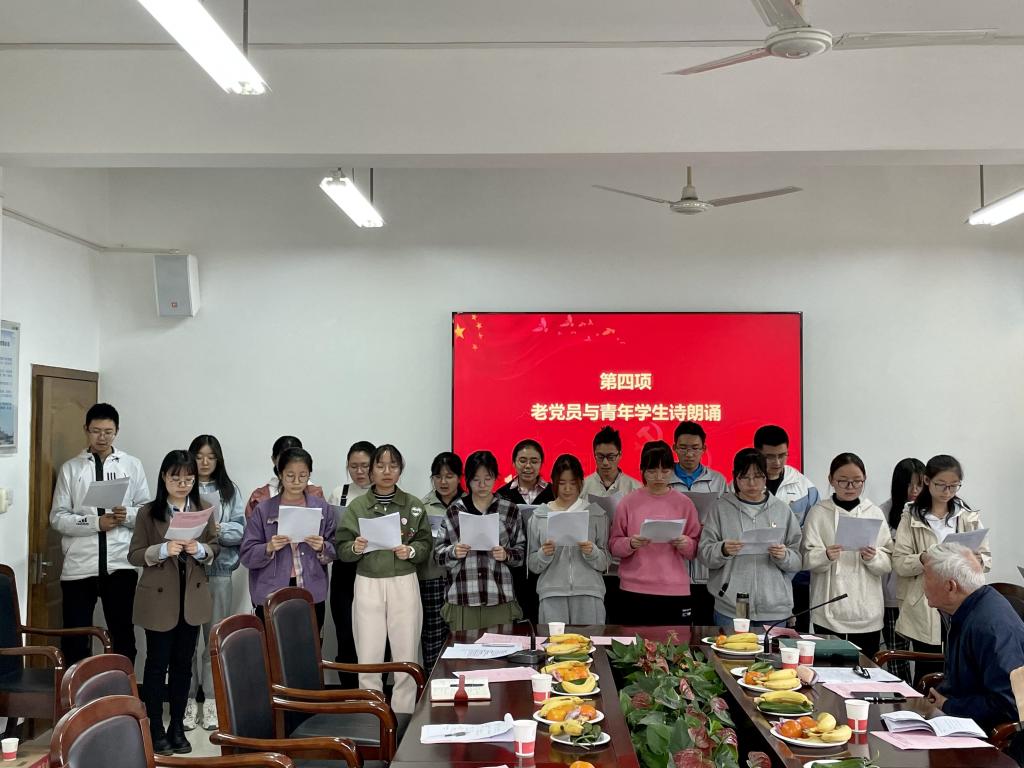 退休党支部的退休教师党员代表甘枝茂老师、张治勋老师、张远广老师、武裕仁老师,分别结合自身奋斗成长的经历与作为共产党员的切身体会,分享了他们所感悟到的这几十年来中国发生的翻天覆地的变化,同时,他们作为共产党员的执着信念、深厚的家国情怀也深深地感染了在场的每一位青年学生,激励着青年学生们不断进步,听党话,跟党走。