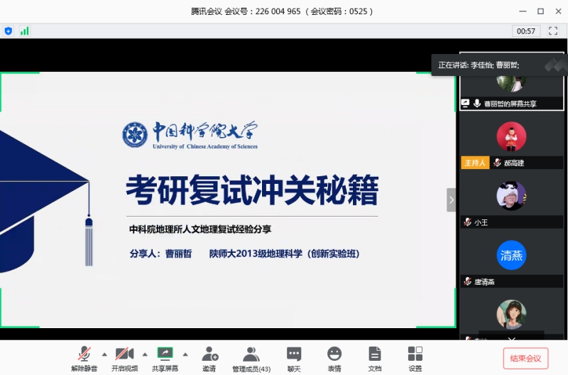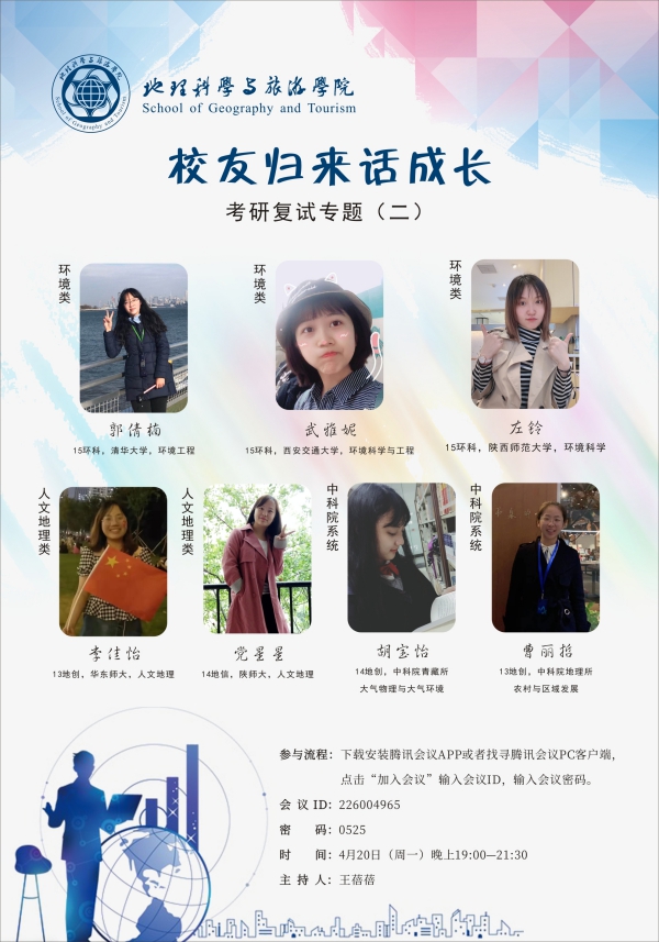 2013级地理科学创新班李佳怡(就读于华东师范大学)、14级地理信息科学党星星(就读于陕师大)、2013级地理科学创新班曹丽哲(就读于中科院地理所)、2014级地理科学创新班胡宝怡(就读于中科院青藏所)、2015级环境科学郭倩楠(就读于清华大学)、2015级环境科学武雅妮(就读于西安交通大学)、2015级环境科学左铃(就读于陕师大)等7位优秀校友在线分享。学院党委副书记郝高建、团委书记王蓓蓓、辅导员张钰超及学院考研、复试的100余名同学参加了交流会。会议由团委书记王蓓蓓主持。
