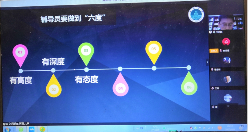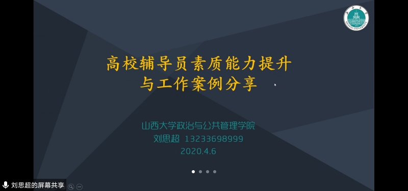4月6日晚,“经纬”辅导员工作室举行“高校辅导员素质能力提升与工作案例分享”线上学习会。山西大学政治与公共管理学院党委副书记、全国辅导员年度人物刘思超老师应邀做了交流分享,工作室全体成员参加了会议。会议由工作室负责人、肉漫画