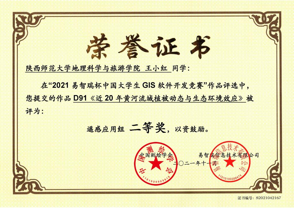 2020级硕士研究生孙高鹏、王小红和马慧榕,在青年教师刘宪锋和李双双的指导下,提交作品《近20年黄河流域植被动态与生态环境效应》,获得遥感应用组二等奖,刘宪锋和李双双被评为优秀指导教师。