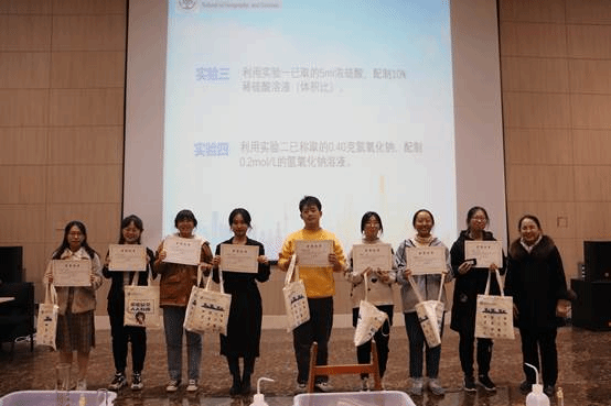 全部本科生和研究生共同参加,同学们先在题库学习后进行了闭卷答题(初赛),各级辅导员阅卷后筛选出本年级4个优胜者,再混合组成四个代表队进行决赛。11月17日晚7点,决赛在热烈的氛围中拉开序幕,学院副院长段克勤老师首先为比赛致辞,他强调“无论是从实验室的使用功能,还是从实验室的自身发展来看,我们都应该强调把实验室的安全防范作为实验室管理的基础”,并郑重宣布本届实验安全知识竞赛决赛正式开始。随后四个代表队分别通过必答题、抢答题环节、隐患查找和实验操作环节决出一等奖1组、二等奖1组、三等奖2组。比赛结束之后,评委老师们分别为同学们进行颁奖,并进行合影留念。
