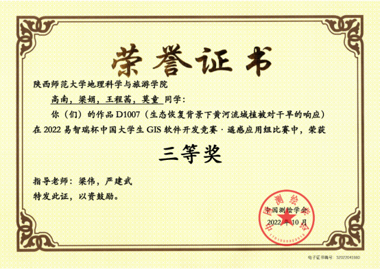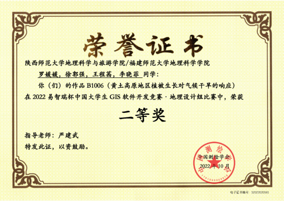 高南、梁娟、王程茜、莫童提交作品《生态恢复背景下黄河流域植被对干旱的响应》,荣获遥感应用组三等奖;