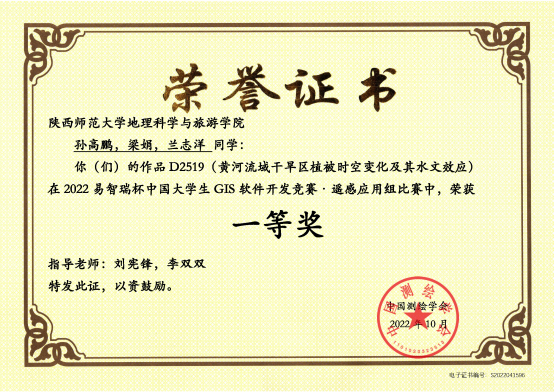 孙高鹏、梁娟、兰志洋提交作品《黄河流域干旱区植被时空变化及其水文效应》,荣获遥感应用组一等奖;