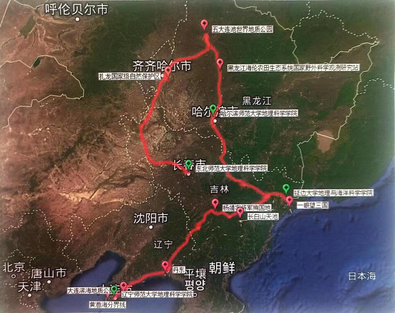 本次野外联合实习紧扣“白山黑土黄海绿江,穿时跨域穷理寻章”设计理念,注重学科前沿与国家战略结合。在自然地理方面主要考察松嫩平原和敦化盆地自然地域结构与演化、五大连池火山地质与地貌、长白山垂直自然带及生物多样性、东北平原河流地貌与水系演化、泥炭沼泽湿地环境演变、海岸地貌与海岸带综合利用等地球表层系统问题;人文地理以人地关系为主线,主要考察东北地区产业结构特征与全面振兴、黑土农业与国家粮食安全、边境贸易与地域文化、红色基因传承与弘扬、城市规划发展以及生态文明建设等。
