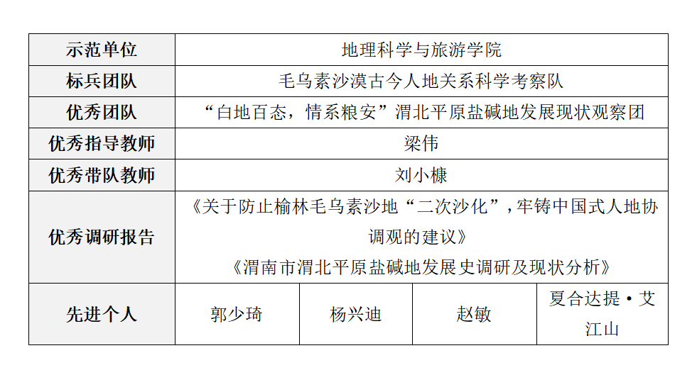 2023年暑期大学生社会实践示范单位称号;毛乌素沙漠古今人地关系科学考察队和“白地百态,情系粮安”渭北平原盐碱地发展现状观察团被评为“标兵团队”和“优秀团队”;梁伟教授和刘小槺副教授分别被评为“优秀指导教师”和“优秀带队教师”,郭少琦等4位同学被评为“先进个人”;《关于防止榆林毛乌素沙地“二次沙化”,牢铸中国式人地协调观的建议》和《渭南市渭北平原盐碱地发展史调研及现状分析》被评为“优秀调研报告”。