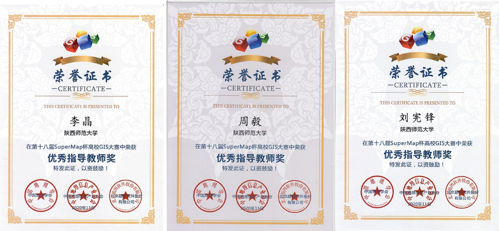 学子喜获三等奖2项、优胜奖1项、鼓励奖1项。其中2017级地理信息科学专业本科生刘洋、任佩、张雅、来洁的参赛作品《渭南市突发公共卫生应急医疗设施选址》获分析组三等奖,2018级地图学与GIS专业研究生王泽涛、王乐、于博的参赛作品《基于深度神经网络的多尺度土地类型分类算法研究》获得论文组三等奖,2019级地图学与GIS专业研究生党辉、张香峰、陈吉臻的团队参赛作品《方舱医院博物馆》获得开发组优胜奖,2019级地图学与GIS专业研究生杨彩勤、刘畅、王泽涛的团队参赛作品《陕西省榆林市生态敏感性制图》获得制图组鼓励奖。李晶、周毅、刘宪锋三位老师分获优秀指导教师奖。