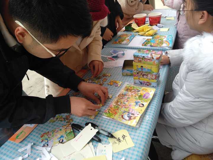 主持人周柏男介绍了比赛规则并宣布比赛正式开始,随后,选手们全情投入,三分钟的时间限制让选手们不免有些慌忙,但在一旁观看的观众们朋友们加油中,20位同学也渐入佳境,比赛激烈而有序的进行着,观众朋友们看得也是十分过瘾。一声哨响,3分钟计时截止,白师傅对选手们的作品仔细查看,一边点评一边挑选着优胜者,大家专注于白师傅的讲解中,比赛的紧张感此刻已全然消失。经过评选得出的五位优胜者由白师傅亲自颁奖并合影留念。精彩的比赛让人意犹未尽,紧接着是我们绿之洲与旅游学社两个社团的的其他活动,一时间我们的场地上有的专心回答“有奖知识问答的”,有的认真进行着“计时地图拼图”,一旁的美食手账本也是记满了同学们的想吃的美食。