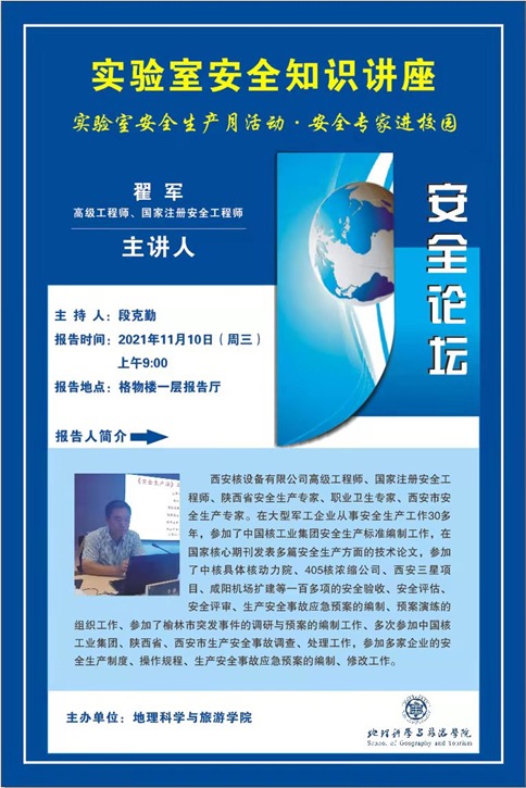 作为2021年实验室安全生产月重要活动内容之一:安全专家进校园,实验中心邀请到了我市安全应急管理专家、国家注册安全工程师翟军老师,针对肉漫画 各类实验室存在的安全隐患进行一次专项讲座,欢迎广大师生前来参会。