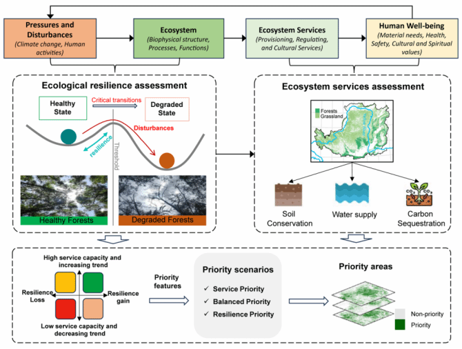 地理科学旅游学院为第一单位。该研究以中国黄土高原为案例,构建了一个整合生态系统服务与生态系统韧性的空间保护规划框架,为生态恢复和国土空间治理中协调短期生态效益与长期系统稳定性提供了新的科学依据。