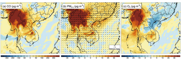 图1:春季东南亚生物质燃烧对近地面(a) CO, (b) PM2.5, (c) O3浓度的影响