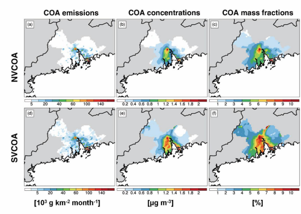 图2:餐饮源有机气溶胶的排放(a,d)、浓度(b,e)、及对总有机气溶胶的质量贡献(c,f)。第一排为在模式中假定餐饮源有机气溶胶为不发生化学反应的惰性成分结果,第二排为假定餐饮源有机气溶胶为半挥发,会发生化学反应生成二次有机气溶胶的模拟结果。
