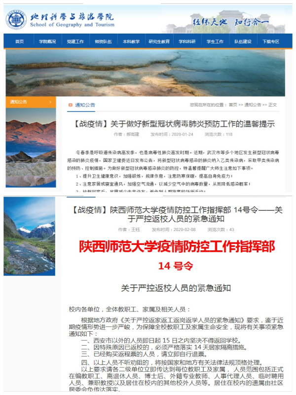 “两点联合”家校联动,共聚合力战疫情。学院充分利用学院网站、家长微信群、QQ群、“我在校园”学生管理系统、“逗逗地科”公众号、与学生家长电话沟通等方式,设立“战疫情”学院宣传专栏,发布学院《关于做好新型冠状病毒肺炎预防工作的温馨提示》、《转扩!个人防护54字守则》等内容,多途径、全覆盖向学院教职工、返家学生、留校学生和学生家长宣传相关防控知识和学校的防控工作要求,呼吁家长关注学生的身心健康情况,告知家长学生不能提前返校,讲清道理及时沟通,共同做好防控工作。